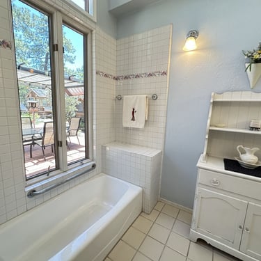 Durable tile flooring runs throughout the cabin, ideal for mountain living, pets, and easy cleanup after a day on the trails.