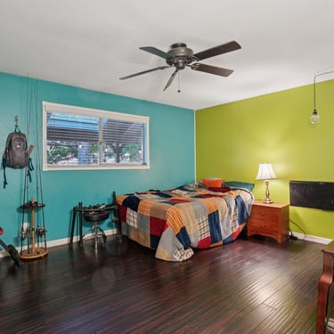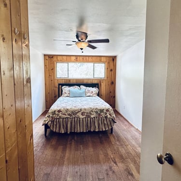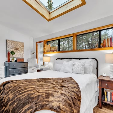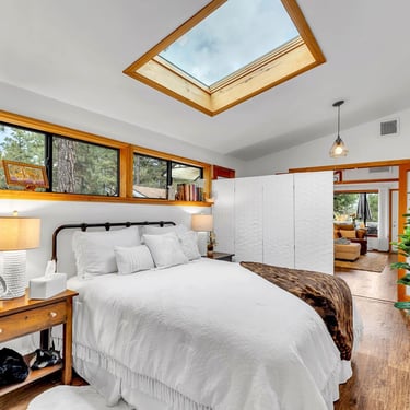 The bedroom offers lots of natural light through it's big picture window, vaulted ceiling with skylight, propane heater and a door leading to the back patio.