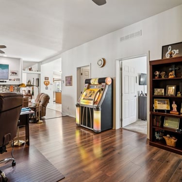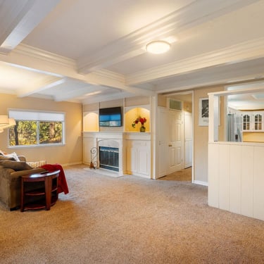 The double-sided fireplace creates a warm ambiance in both the living room and the den, where you'll find an ideal space for a home office.