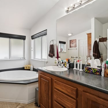 The primary suite is a true retreat, featuring an additional sitting area, a spacious walk-in closet, a luxurious corner tub, and private deck access for peaceful mornings or evenings.