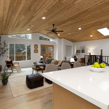 The upstairs level features soaring vaulted ceilings, an open-concept living, dining, and kitchen area filled with natural light from skylights and clerestory windows, and breathtaking treetop views.