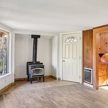 The cozy living room features a wood-burning stove for those crisp Idyllwild days and nights, creating a warm, inviting focal point.