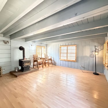 Inside, vaulted ceilings and skylights fill the home with natural light, while the cozy wood burning stove creates a warm focal point in the living room.