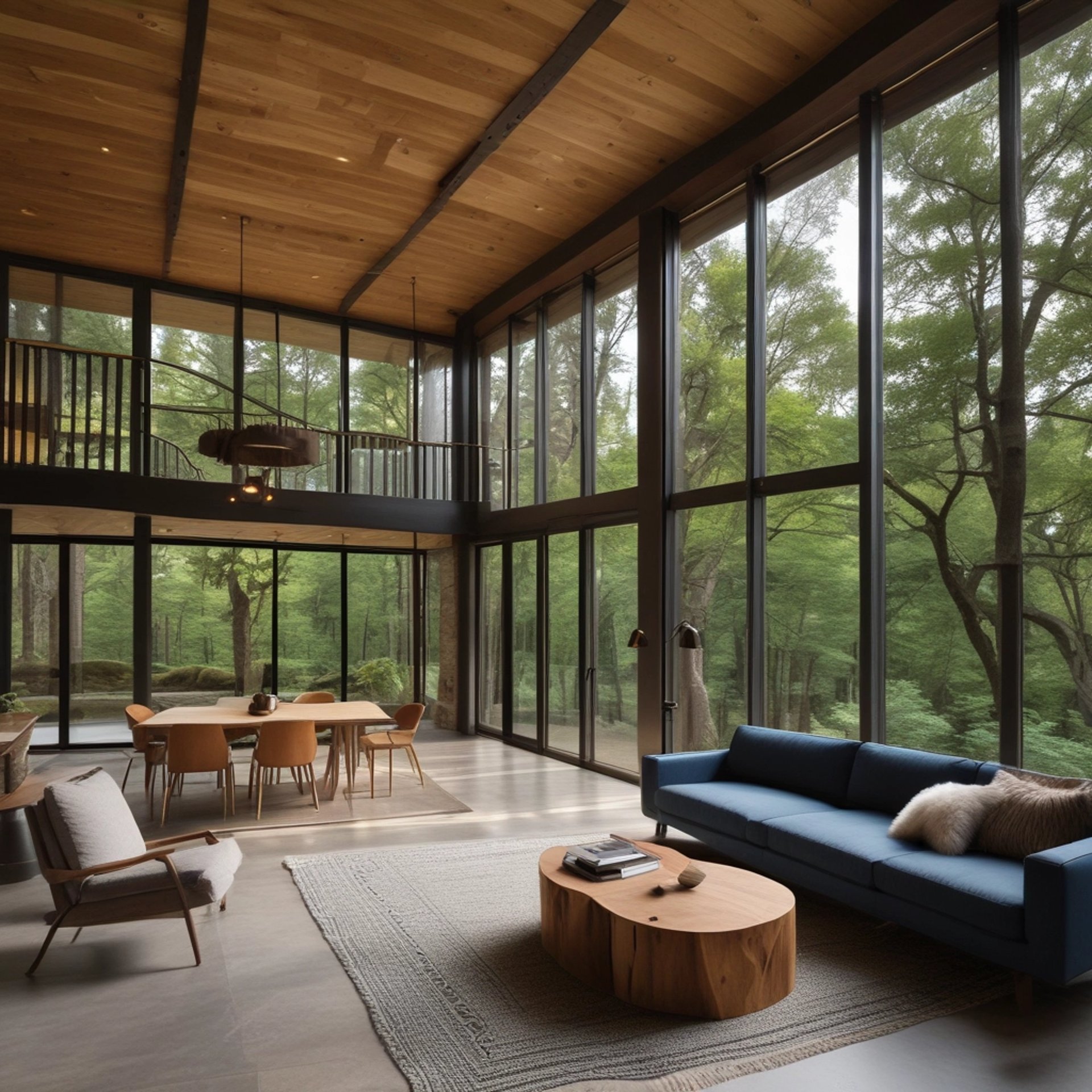 Large windows capture natural light and forest views, creating a peaceful retreat feel.