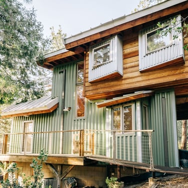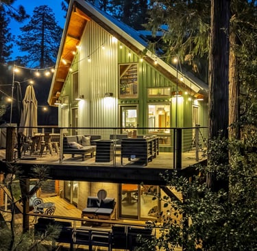 Tucked among the pines, this updated A-frame blends an industrial edge with rustic mountain charm.
