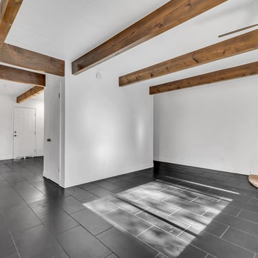 Vaulted ceilings with exposed wood beams soar above an open-concept living space anchored by a freestanding wood stove and warmed by heated floors.