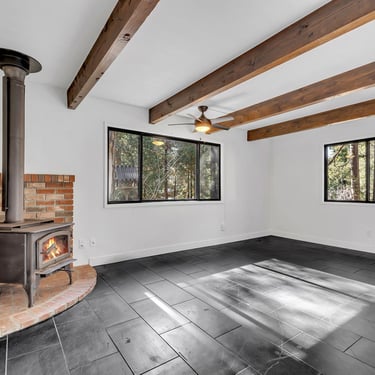 The cozy living room features a wood-burning stove for those crisp Idyllwild days and nights, creating a warm, inviting focal point.