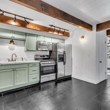 The remodeled kitchen boasts newer appliances, including a range, dishwasher, and fridge, making meal prep a breeze.
