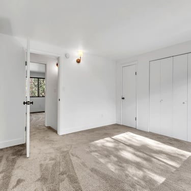 The bedroom offers lots of natural light through it's big picture window, vaulted ceiling with skylight, propane heater and a door leading to the back patio.
