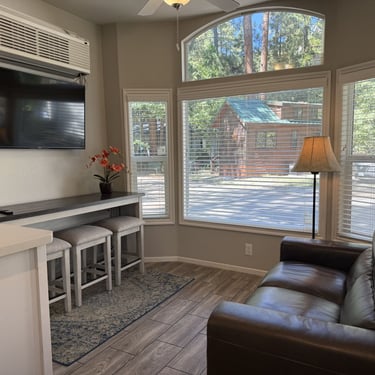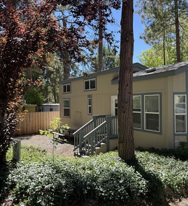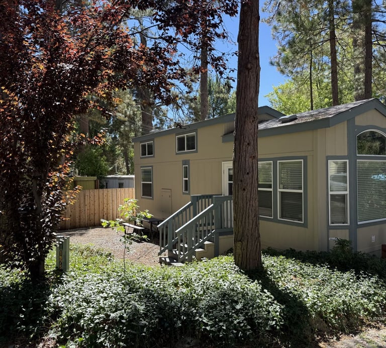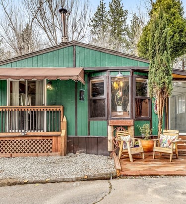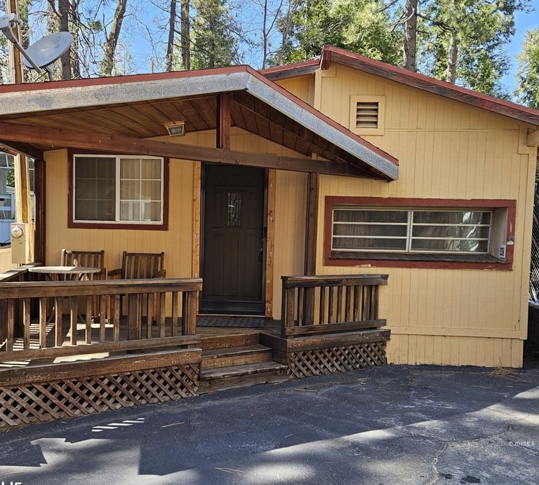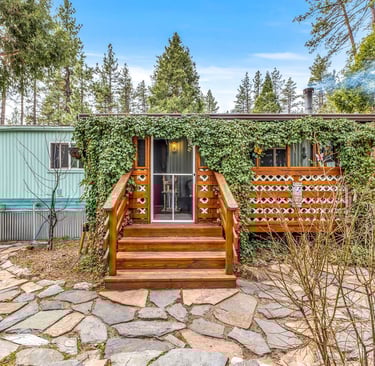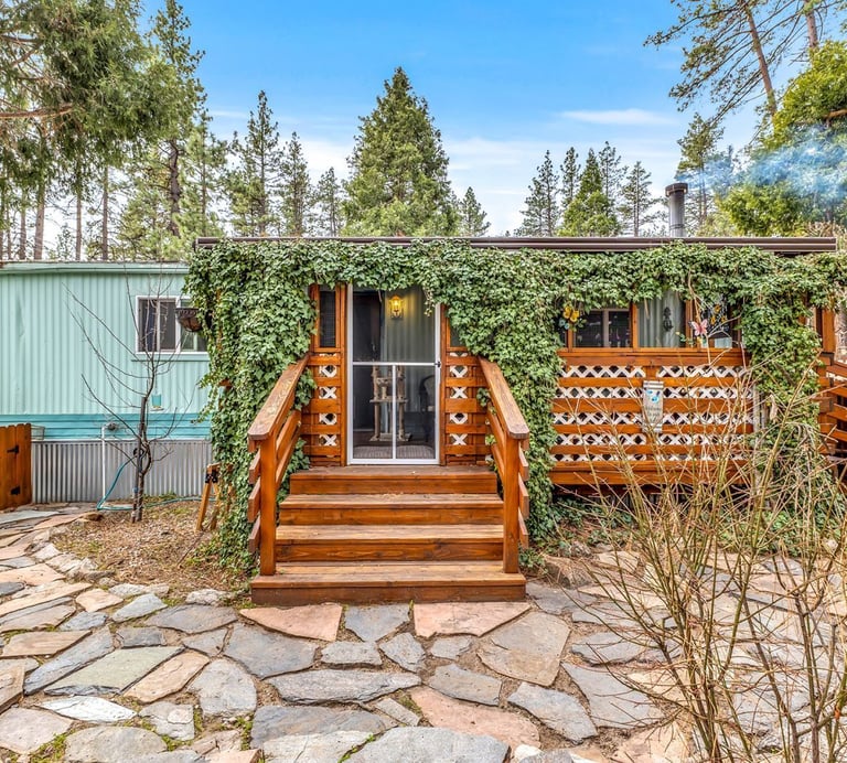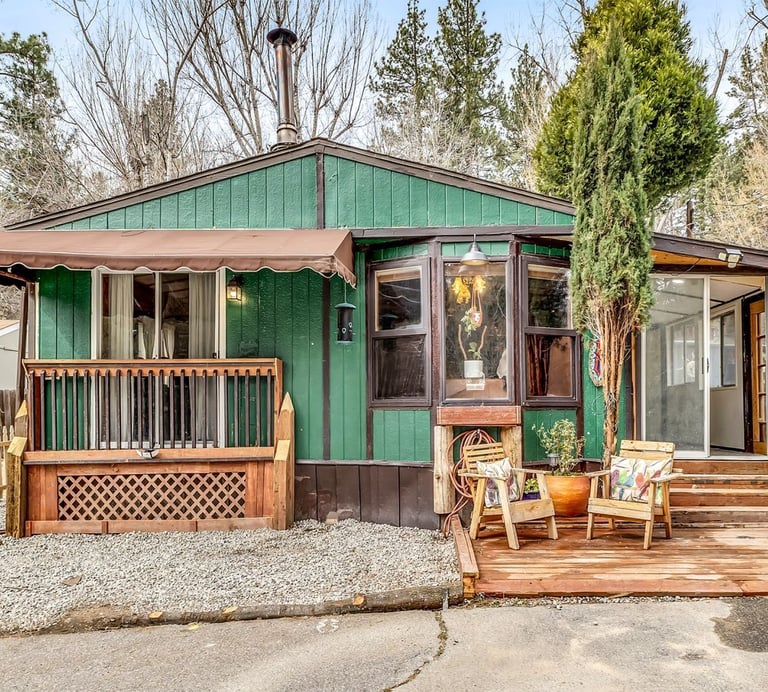 Charming 2-bedroom, 1.5-bath mobile home offering a warm cabin-style exterior just minutes from town, shopping, dining, and local hiking trails.
