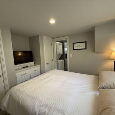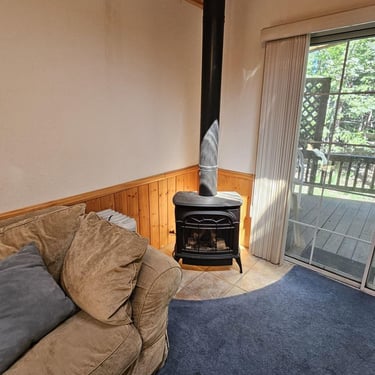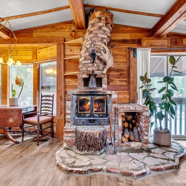 This one bedroom, with bonus sleeping space, features a spacious living area welcoming you with a warm, inviting ambiance, highlighted by a striking vintage wood-burning Malm fireplace at the heart of the home.