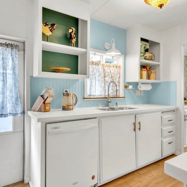 The retro kitchen features classic vintage appliances, perfect for preparing meals while embracing the nostalgia of yesteryear.
